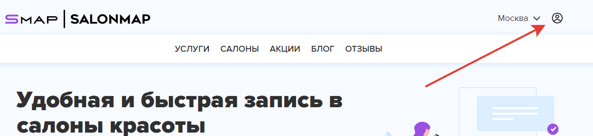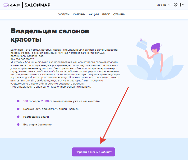 Либо на странице Салонам красоты нажмите кнопку “Перейти в личный кабинет”