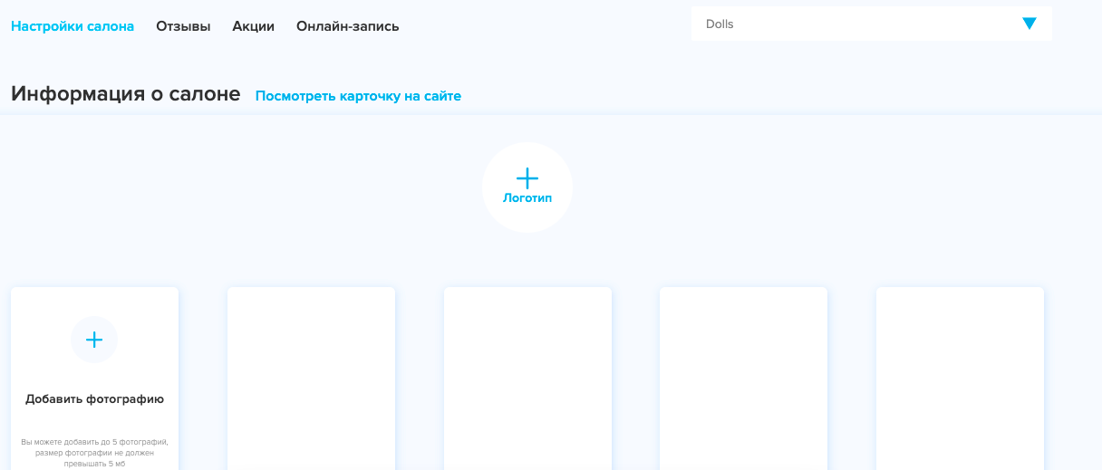 После перехода на страницу Личный кабинет вы окажетесь на вкладке Настройки салона. После заполнения полей Название и Адрес салона, у вас появится активная кнопка Посмотреть на сайте.